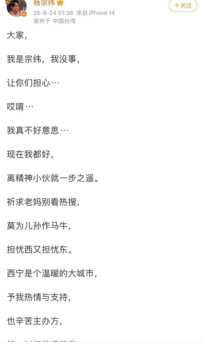 8月24日凌晨,杨宗纬在社交平台报平安。称“现在我都好,离精神小伙就一步之遥,祈求老妈别看热搜。”